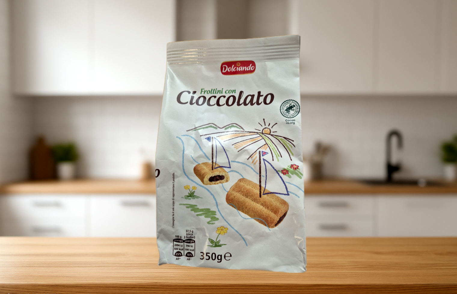 A Dolciando Frollini csokidarabos keksz omlós, vajas tésztájú finomság, tele ropogós, valódi csokidarabokkal. Tökéletes kávé, tea mellé vagy mindennapi nassolnivalónak.